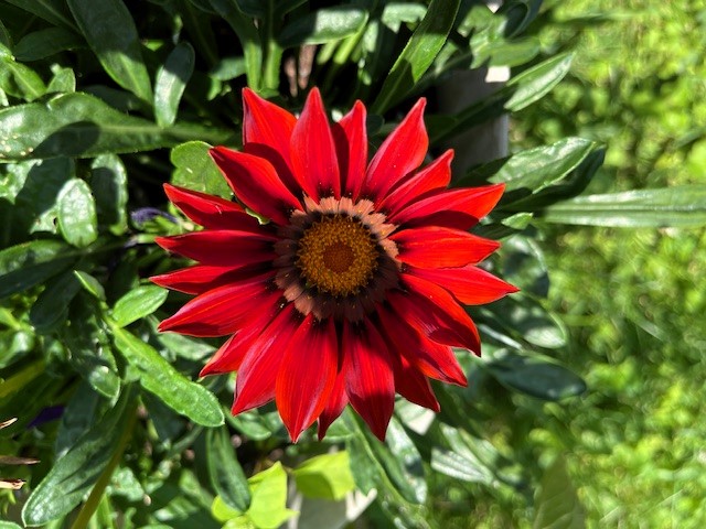 Variegated geranium. These are orange but for some reason, always photograph as red.
